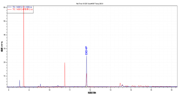 合格品TIC图(浅蓝色)与邻苯混标TIC图(白)