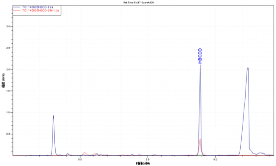 样品管理TIC图(紫色)与六溴环12烷标准规范品TIC图(黄白色)