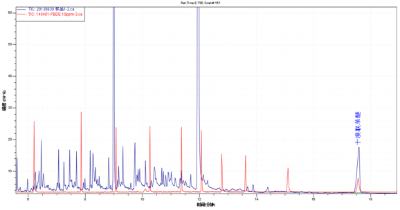检样TIC图(深蓝色)与多溴联苯醚混标TIC图(白色的)
