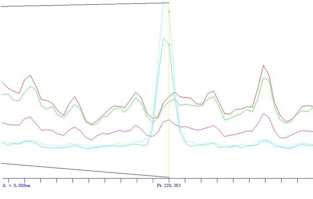 采用ICPapp软件谱线库展现给往往属性反差谱线,起首取舍被测属性活动性好 的谱线,再者斟酌不用原材料基体及被测属性两方彼此搅扰小的谱线的准绳,取舍阐发线下类。